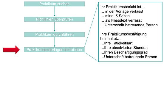 Der Praktikumsbericht inklusive Praktikumsbestätigung liegt dem Studiendekanat spätestens per Ende des akademischen Semesters vor (gemäss Überschrift "Einreichung der Unterlagen").